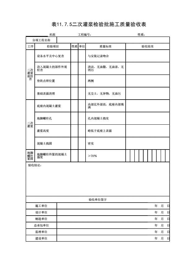 表11.7.5 二次灌浆检验批施工质量验收表