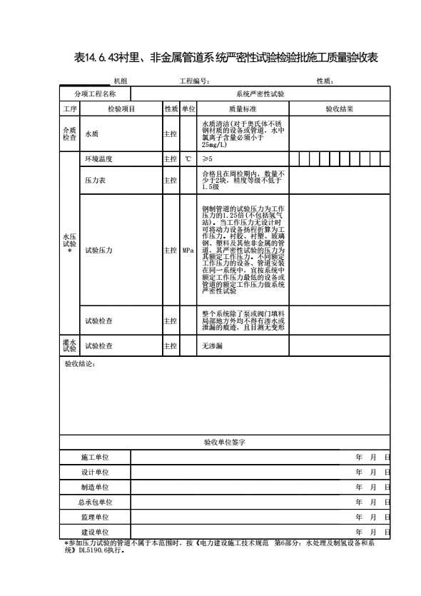 表格名称:表14.6.43 衬里、非金属管道系统严密性试验检验批施工质量验收表
