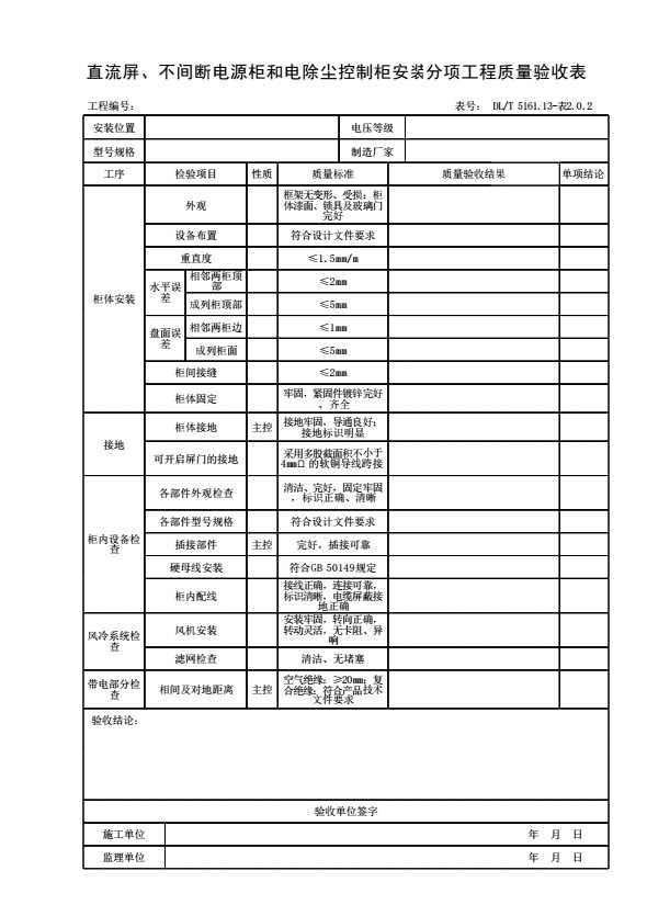 表格名称:表2.0.2 直流屏、不间断电源柜和电除尘控制柜安装分项工程质量验收表