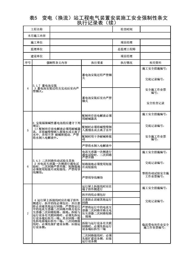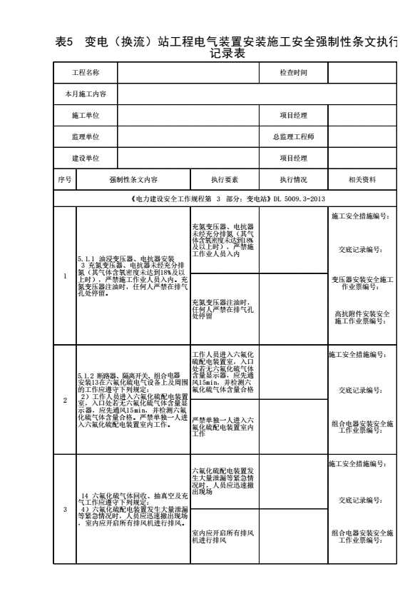 表格名称:表5 变电(换流)站工程电气装置安装施工安全强制性条文执行记录表