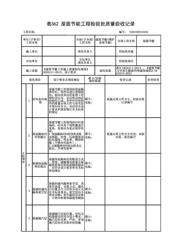 表格名称:020109010401 屋面节能工程检验批质量验收记录