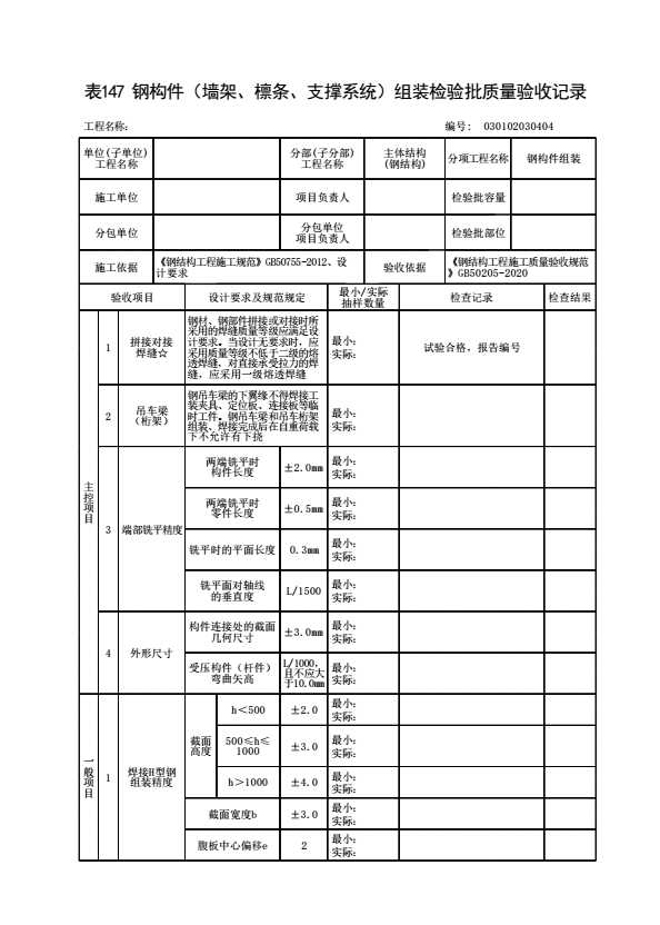 表格名称:030102030404 钢构件(墙架、檩条、支撑系统)组装检验批质量验收记录