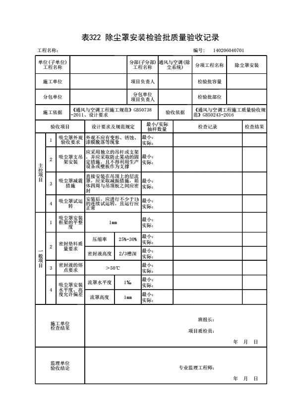 表格名称:140206040701 除尘罩安装检验批质量验收记录