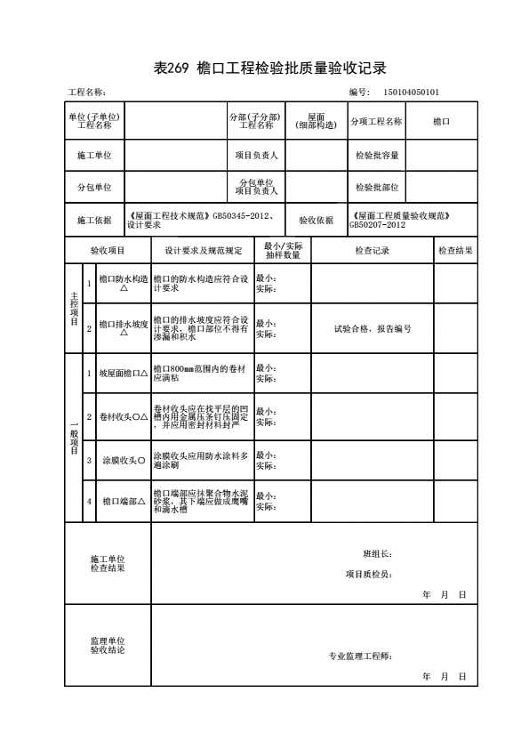 表格名称:150104050101 檐口工程检验批质量验收记录