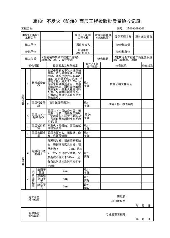 表格名称:150303010206 不发火(防爆)面层工程检验批质量验收记录