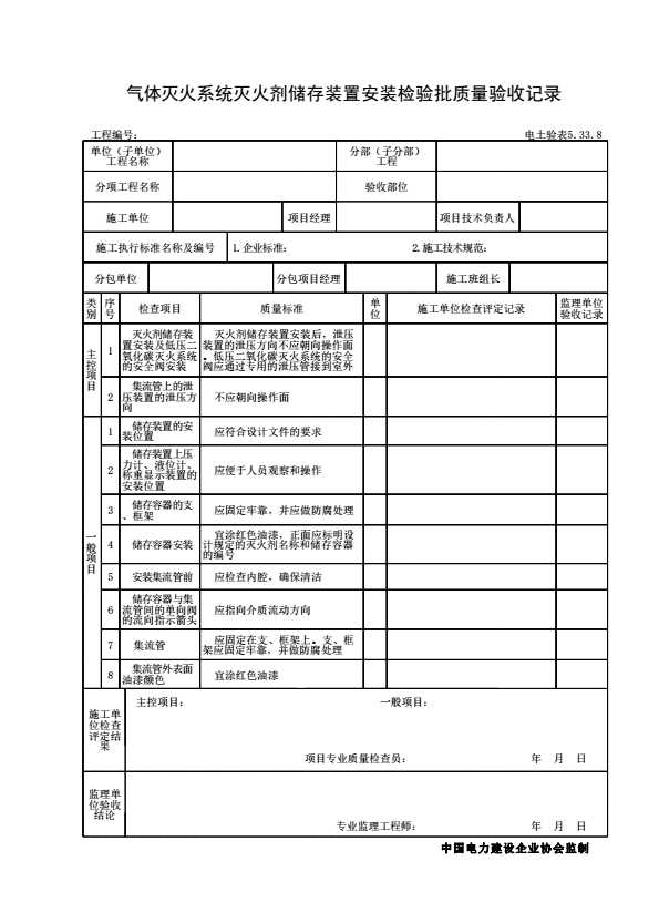 表格名称:电土验表5.33.8 气体灭火系统灭火剂储存装置安装检验批质量验收记录
