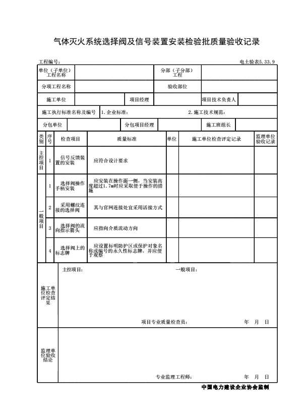 表格名称:电土验表5.33.9 气体灭火系统选择阀及信号装置安装检验批质量验收记录