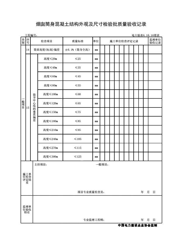 表格名称:电土验表6.10.16 烟囱筒身混凝土结构外观及尺寸检验批质量验收记录