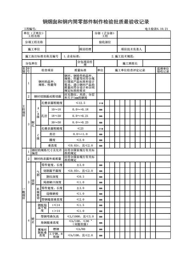 表格名称:电土验表6.10.21 钢烟囱和钢内筒零部件制作检验批质最验收记录