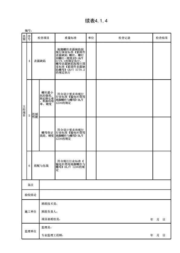 表格名称:表4.1.4 地脚螺栓检验批质量验收记录