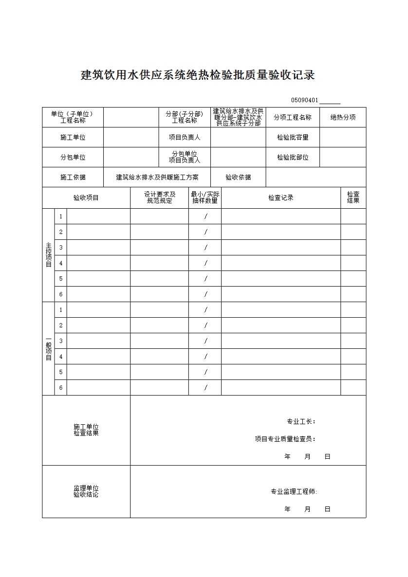 表格名称:05090401_建筑饮用水供应系统绝热检验批质量验收记录