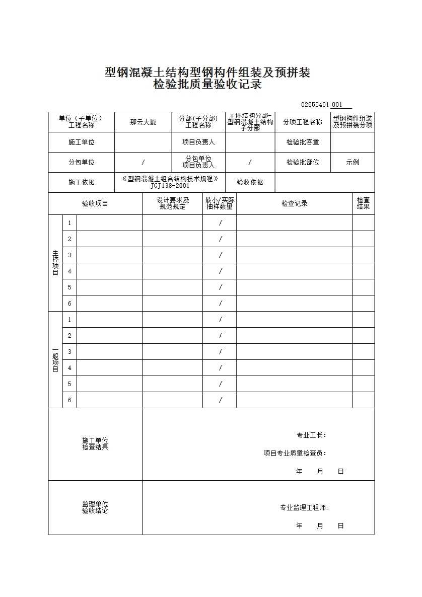 表格名称:02050401_型钢混凝土结构型钢构件组装及预拼装检验批质量验收记录