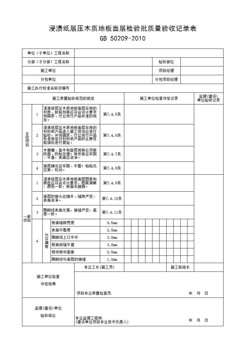 表格名称:浸渍纸层压木质地板面层检验批质量验收记录表