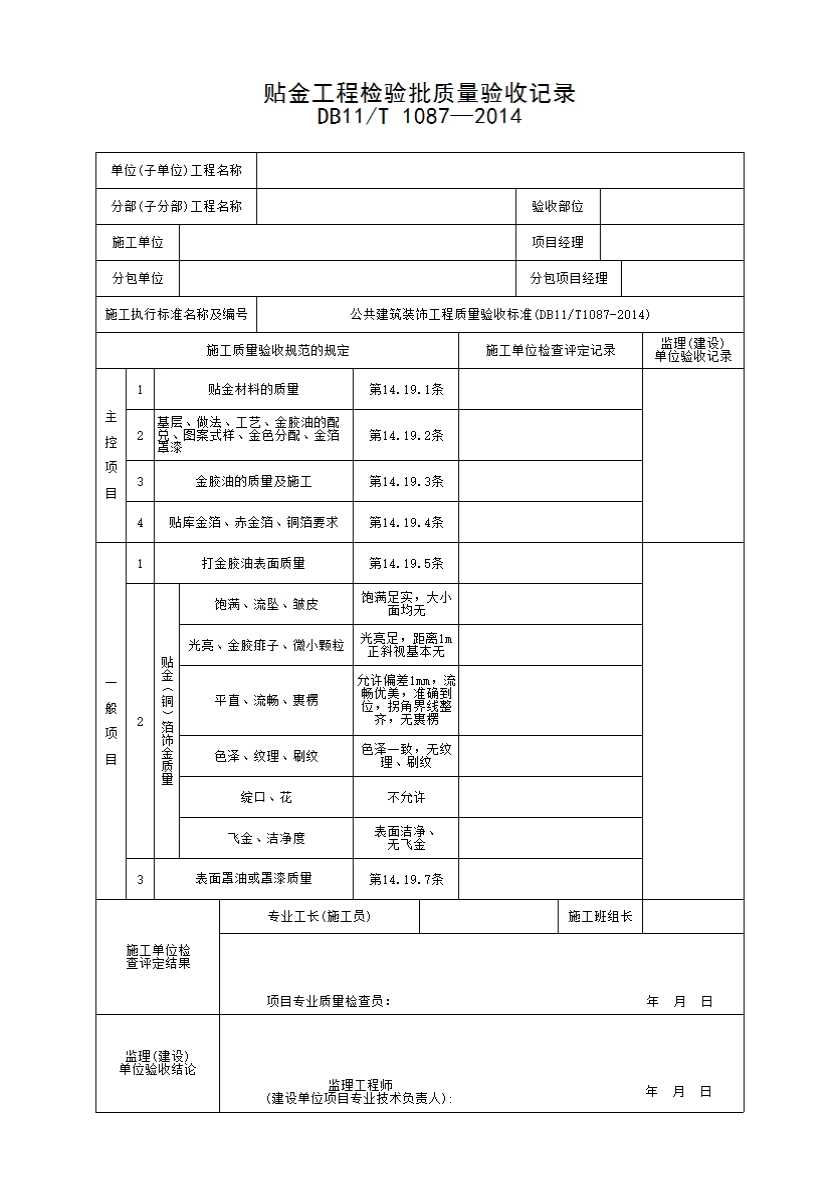 表格名称:贴金工程检验批质量验收记录