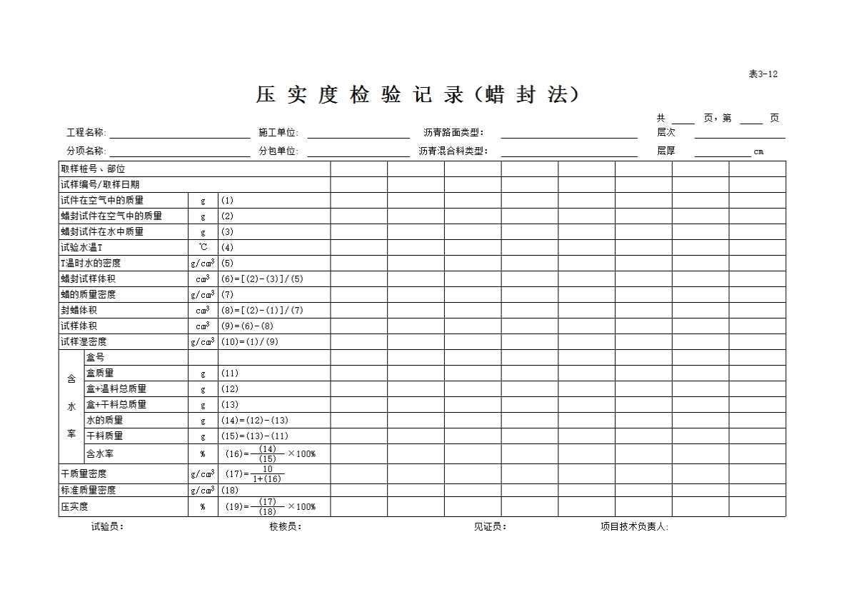表格名称:表3-12 压实度检验记录(蜡封法)