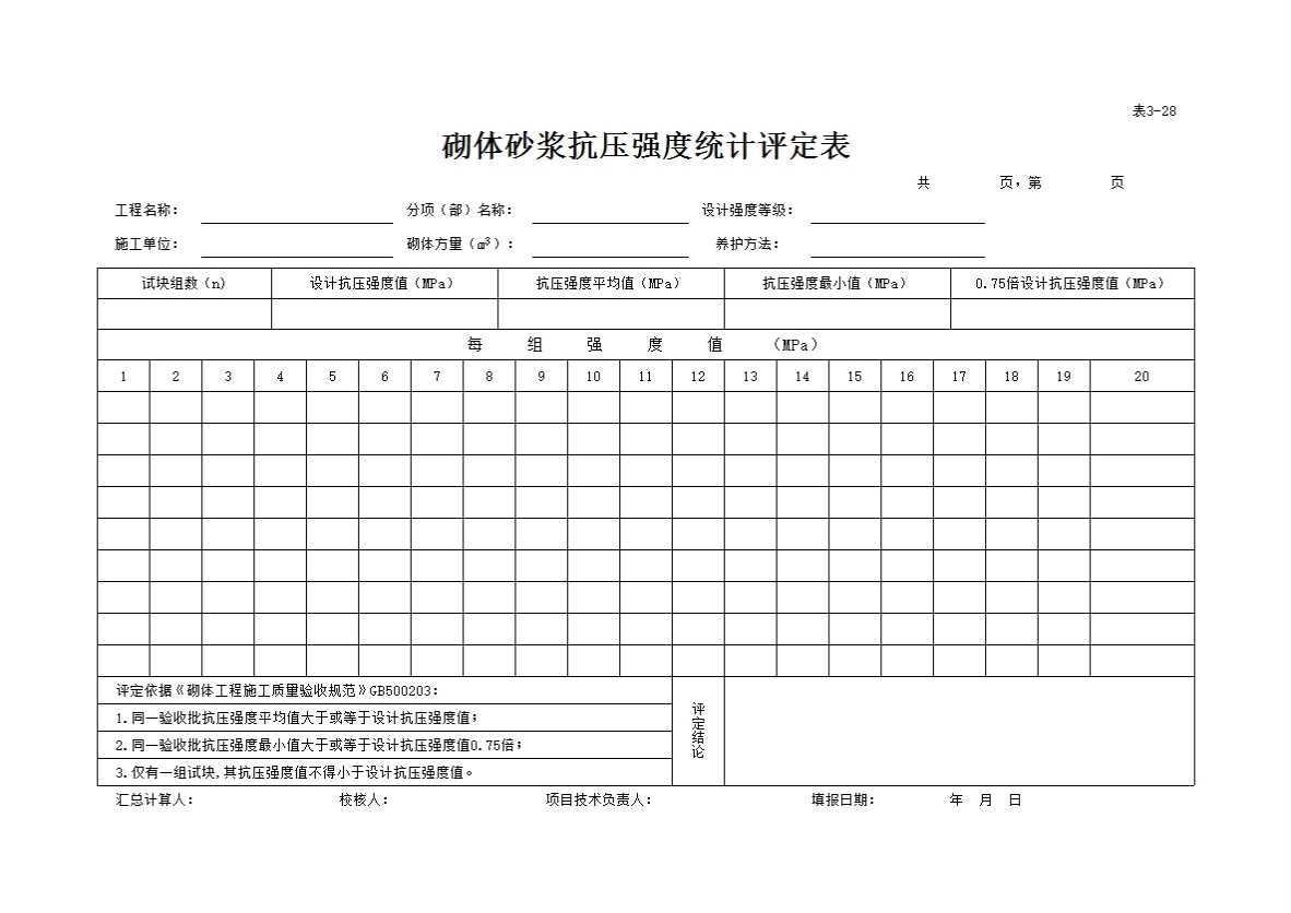 表格名称:表3-28 砌体砂浆抗压强度统计评定表
