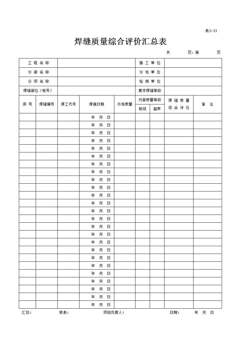 表格名称:表3-33 焊缝质量综合评价汇总表