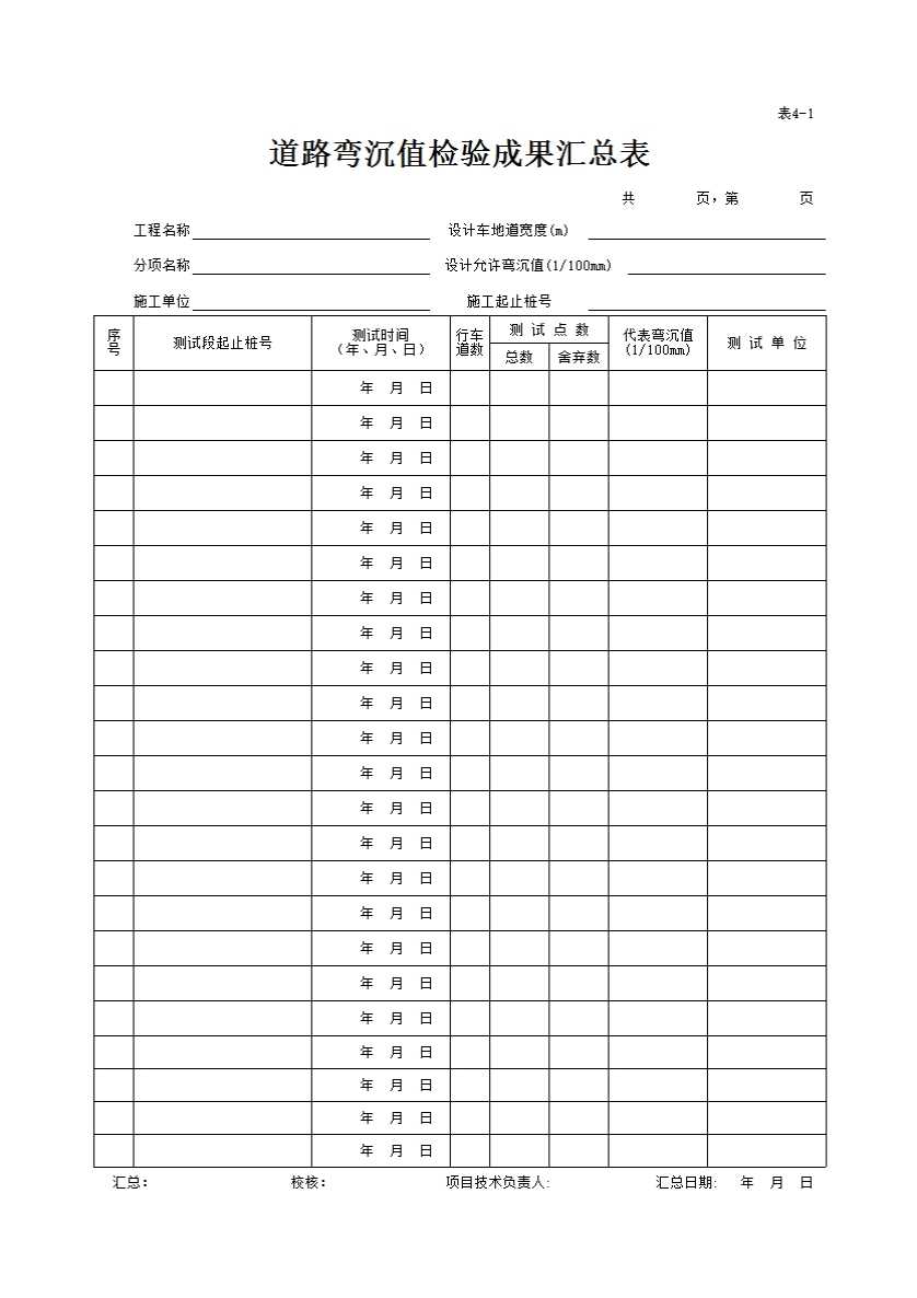 表格名称:表4-1 道路弯沉值检验成果汇总表