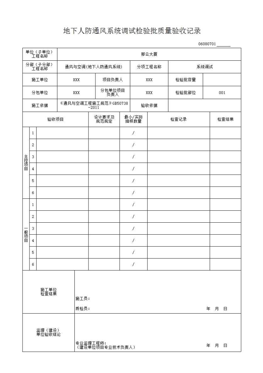 表格名称:06080701_地下人防通风系统调试检验批质量验收记录