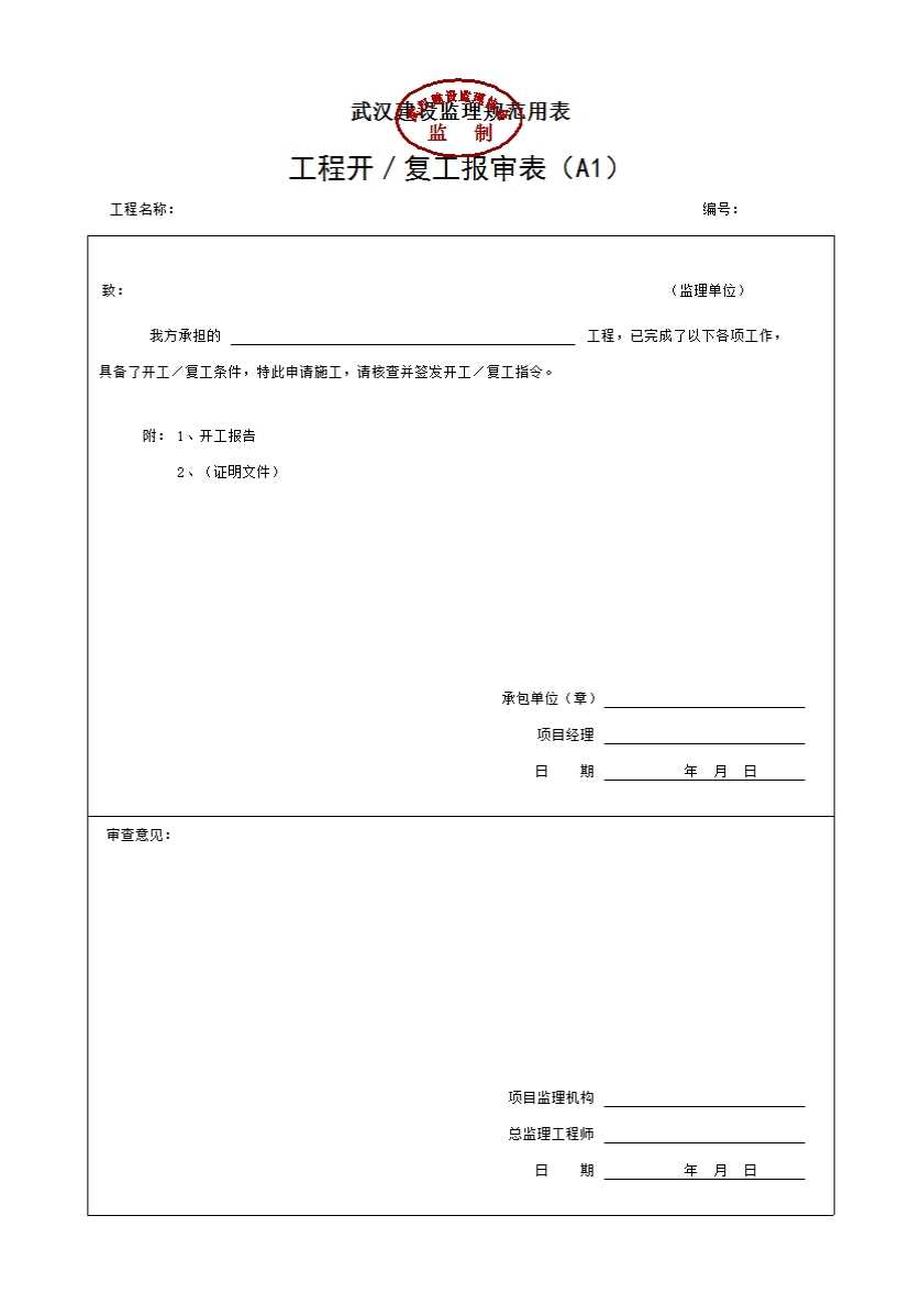 表格名称:A1 工程开/复工报审表