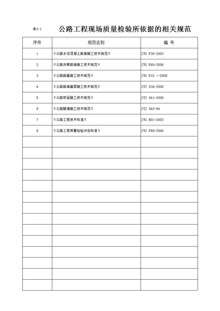 表格名称:表3-1 表公路工程现场质量检验所依据的相关规范