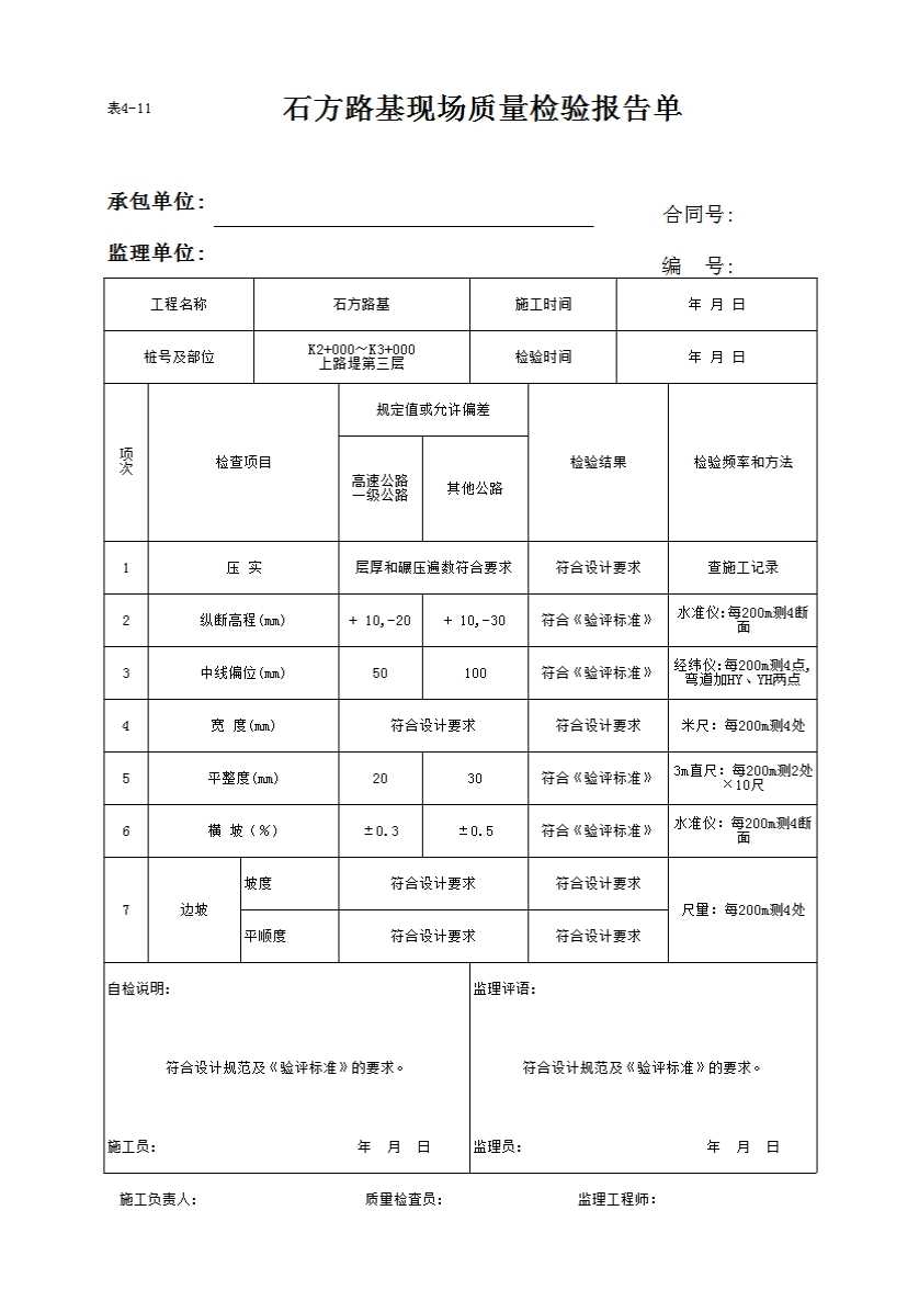 表格名称:表4-11 石方路基现场质量检验报告单