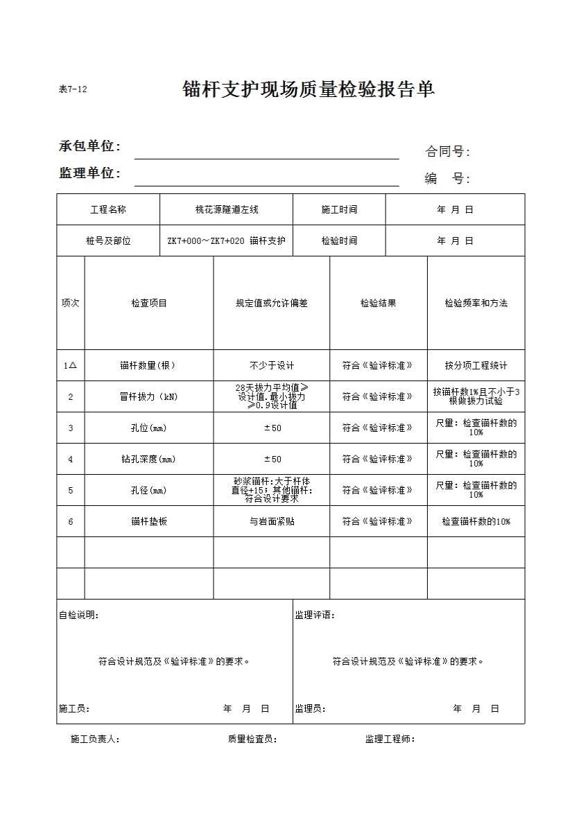 表格名称:表7-12 锚杆支护现场质量检验报告单