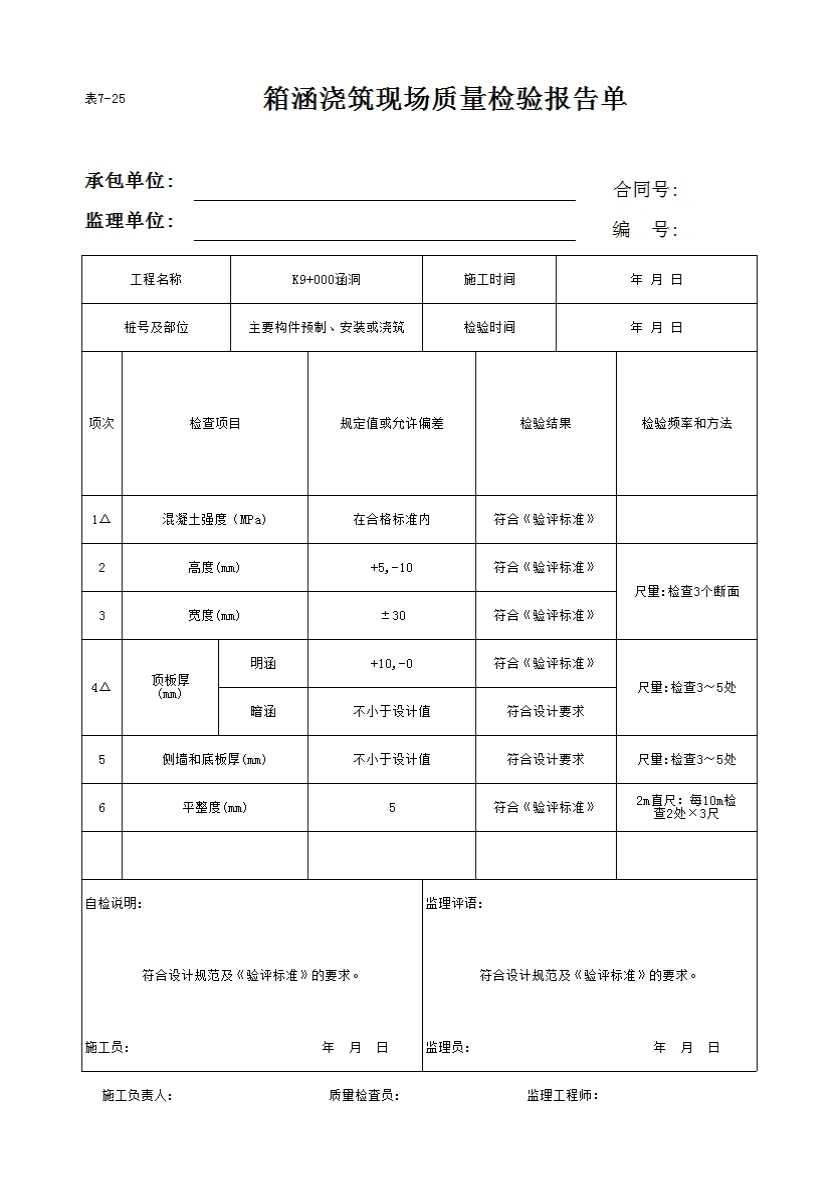 表格名称:表7-25 箱涵浇筑现场质量检验报告单