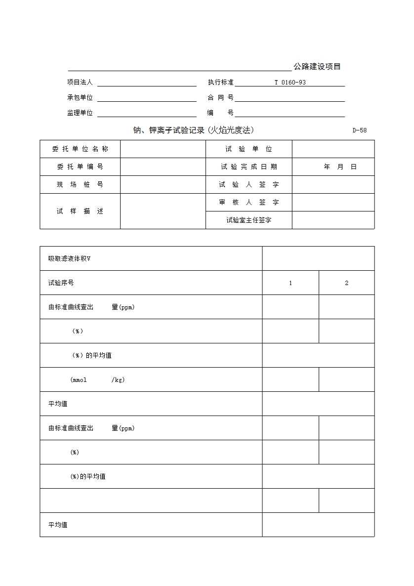 表格名称:D-58 钠、钾离子试验记录(火焰光度法)