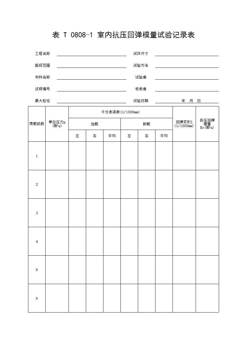 表 T 0808-1 室内抗压回弹模量试验记录表