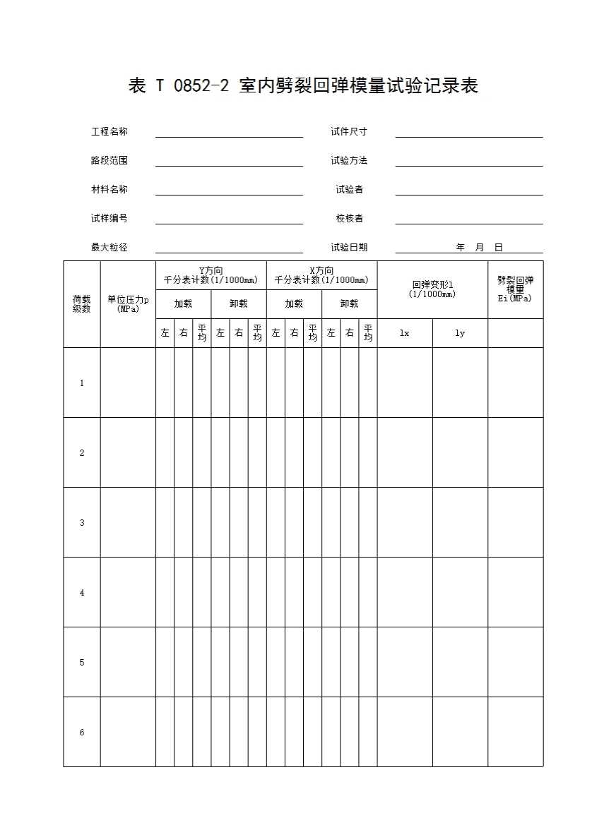 表格名称:表 T 0852-2 室内劈裂回弹模量试验记录表