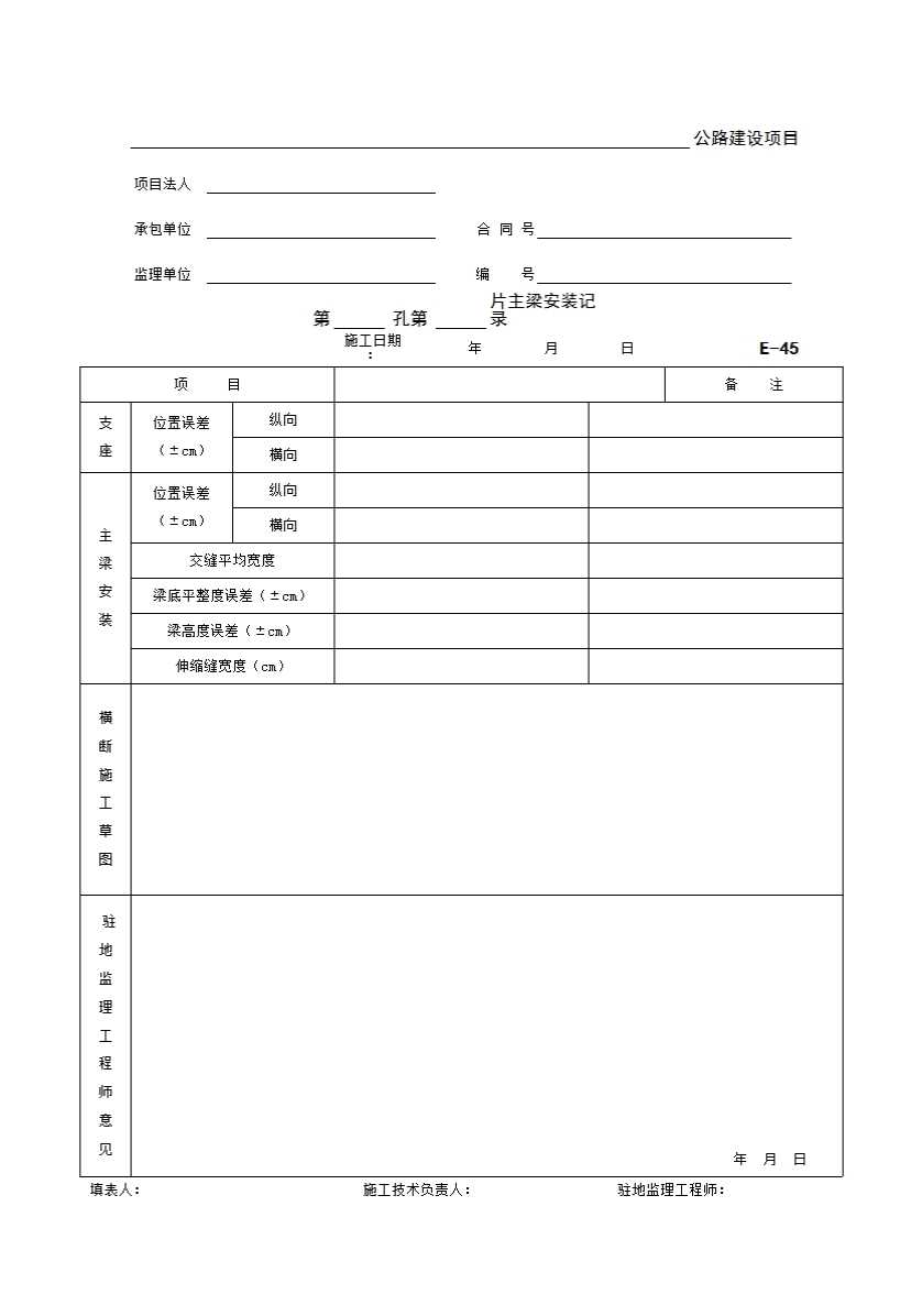 表格名称:E-45 第 孔第 片主梁安装记录