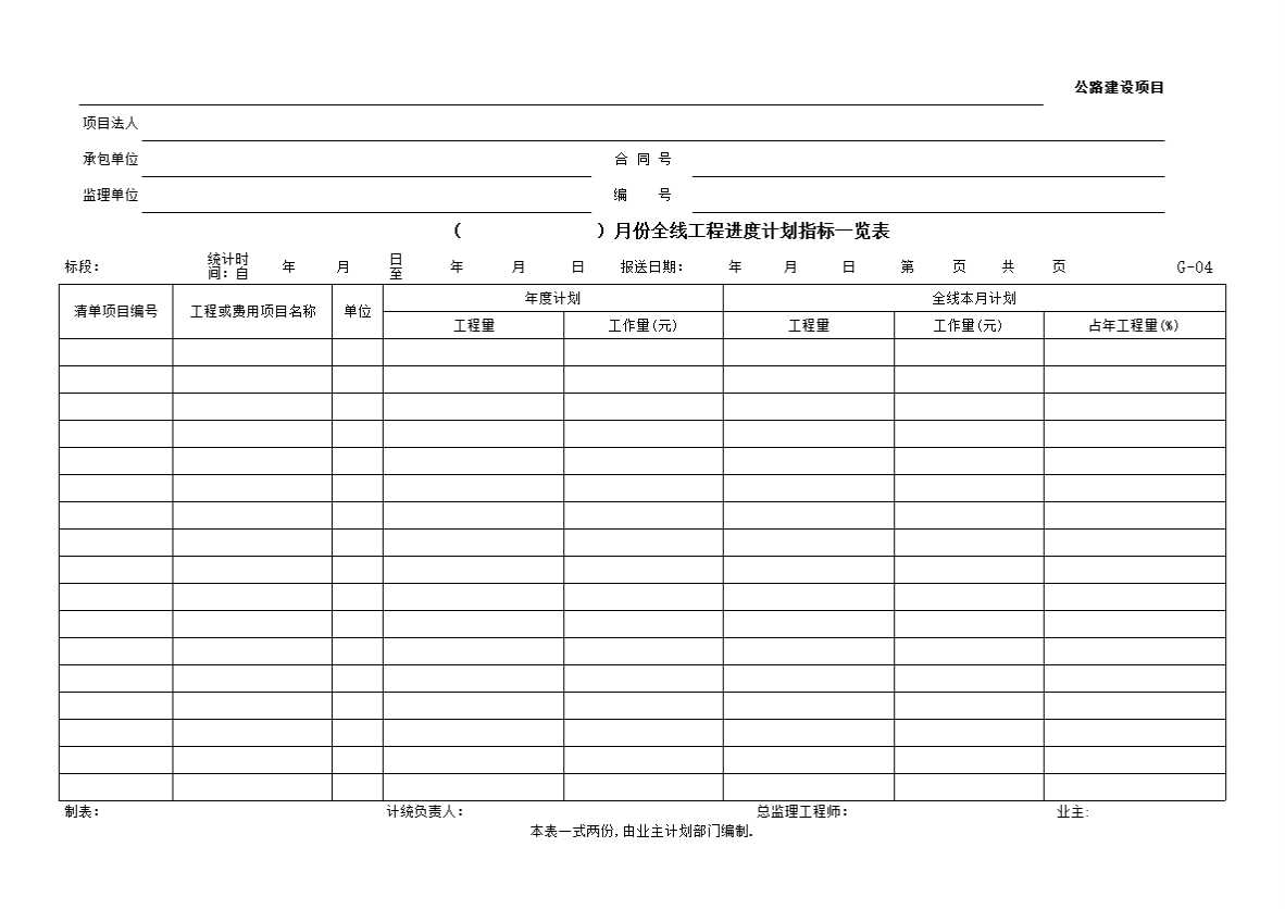 表格名称:G-14 ( )月份全线工程进度计划指标一览表