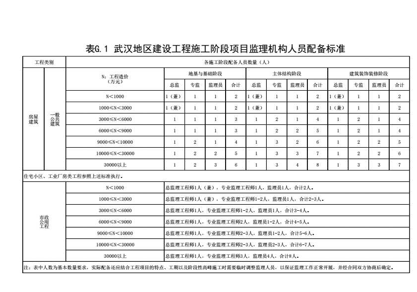 表格名称:表G.1 武汉地区建设工程施工阶段项目监理机构人员配备标准