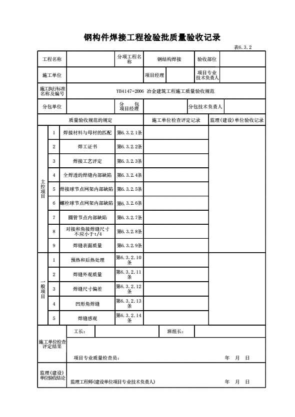 表格名称:表6.3.2 钢构件焊接工程检验批质量验收记录