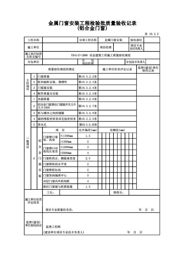 表格名称:表10.3.2 金属门窗安装工程检验批质量验收记录(铝合金门窗)