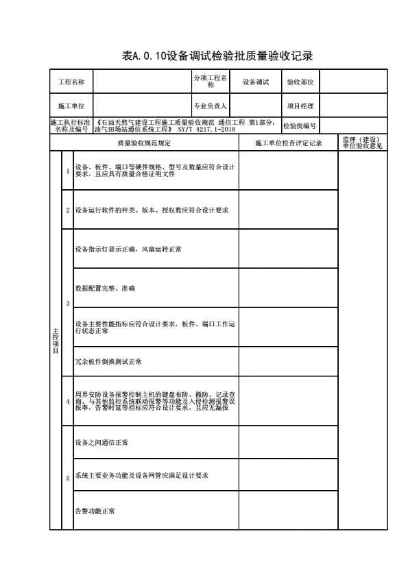 表格名称:表A.0.10 设备调试检验批质量验收记录