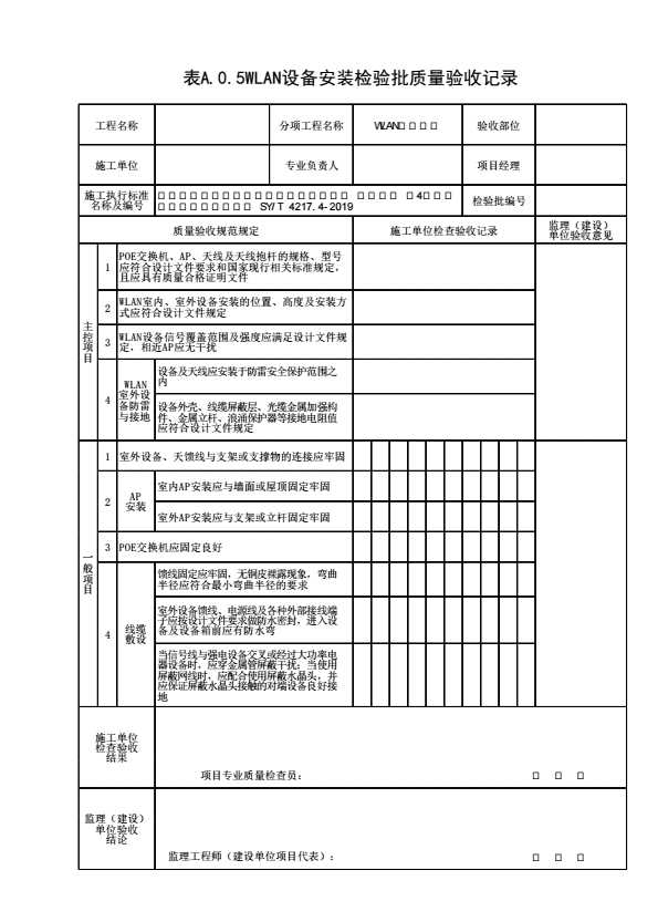 表格名称:表A.0.5 WLAN设备安装检验批质量验收记录