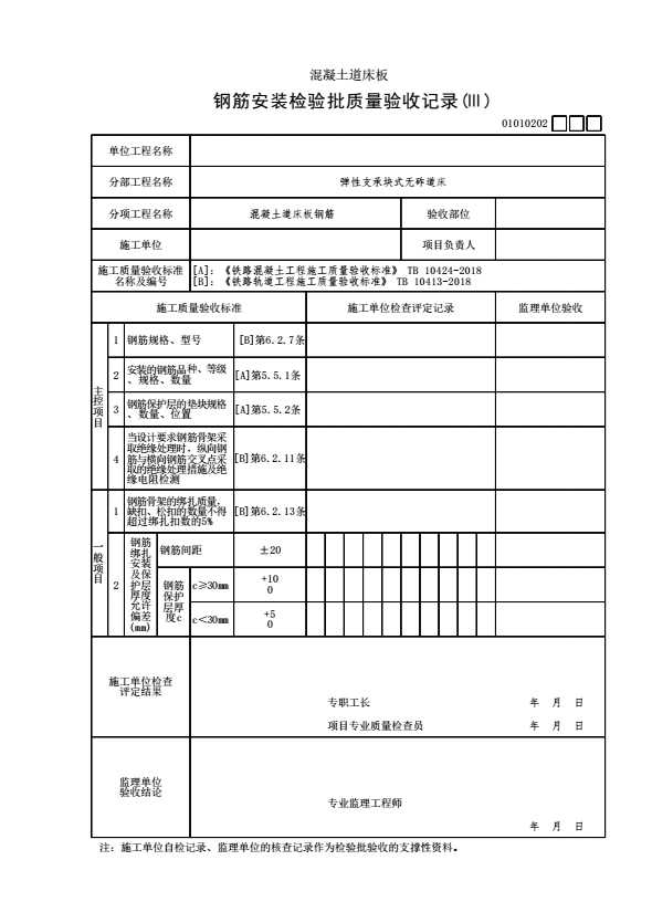 表格名称:01010202 【混凝土道床板】钢筋安装检验批质量验收记录(Ⅲ)