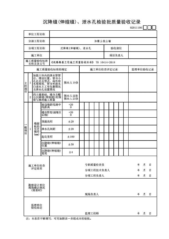 表格名称:02011106 沉降缝(伸缩缝)、泄水孔检验批质量验收记录
