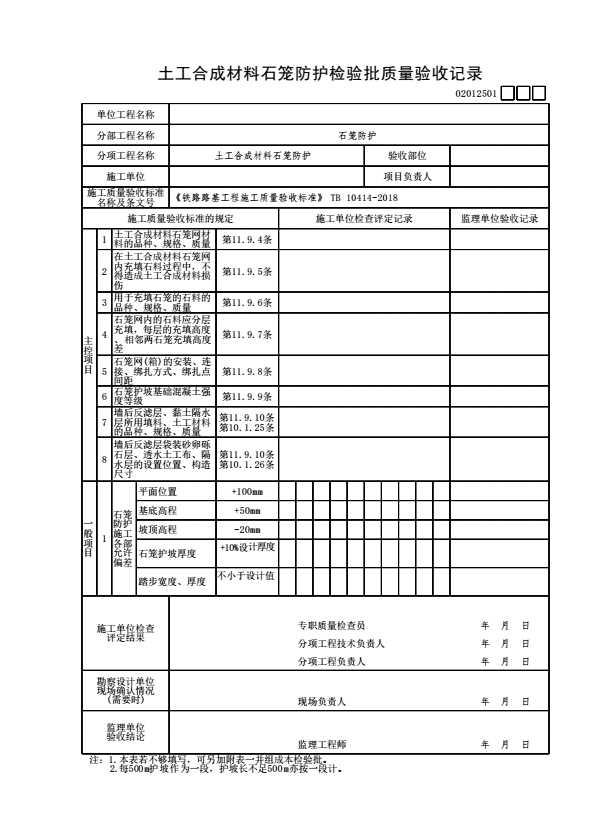 表格名称:02012501 土工合成材料石笼防护检验批质量验收记录