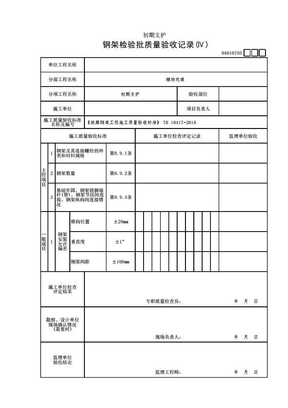 表格名称:04010703 【初期支护】钢架检验批质量验收记录(Ⅳ)