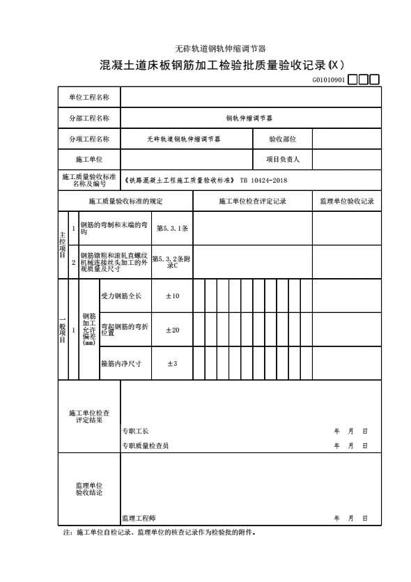 G01010901 【无砟轨道钢轨伸缩调节器】混凝土道床板钢筋加工检验批质量验收记录(Ⅸ)