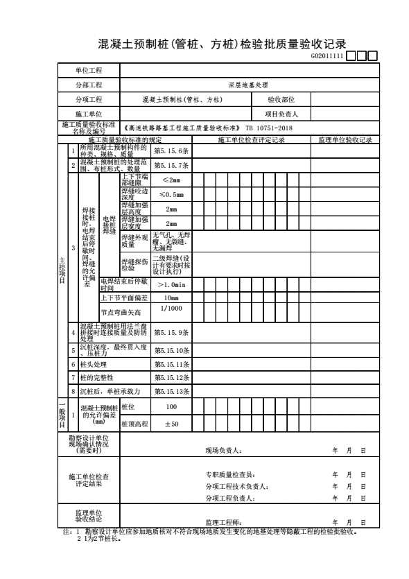 表格名称:G02011111 混凝土预制桩(管桩、方桩)检验批质量验收记录