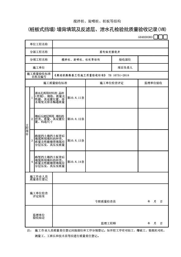 表格名称:G04030303 【搅拌桩、旋喷桩、桩板等结构】(桩板式挡墙)墙背填筑及反滤层、泄水孔检验批质量验收记录(Ⅷ)