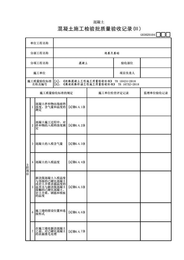 表格名称:G03020104 【混凝土】混凝土施工检验批质量验收记录(Ⅲ)