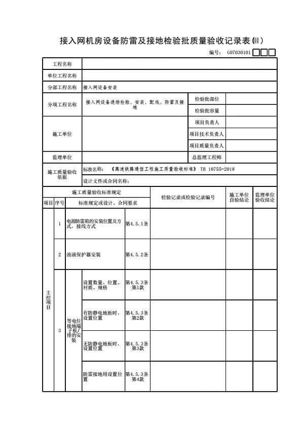G07030101 接入网机房设备防雷及接地检验批质量验收记录表(Ⅲ)