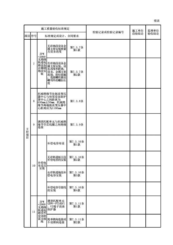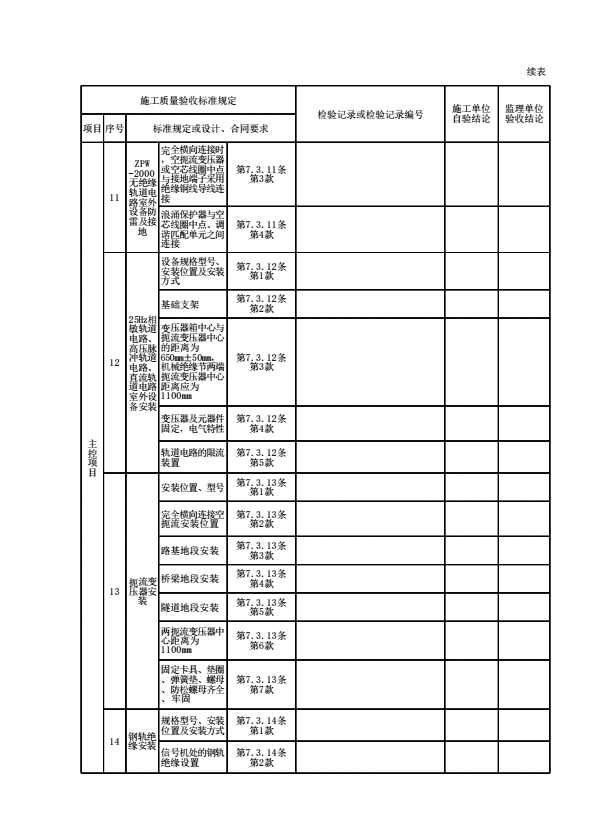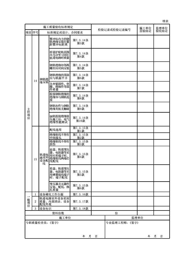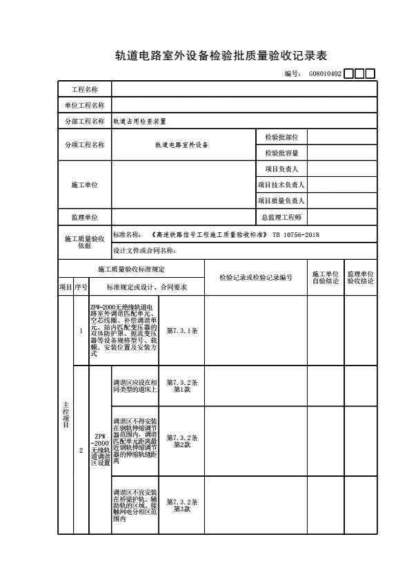 表格名称:G08010402 轨道电路室外设备检验批质量验收记录表
