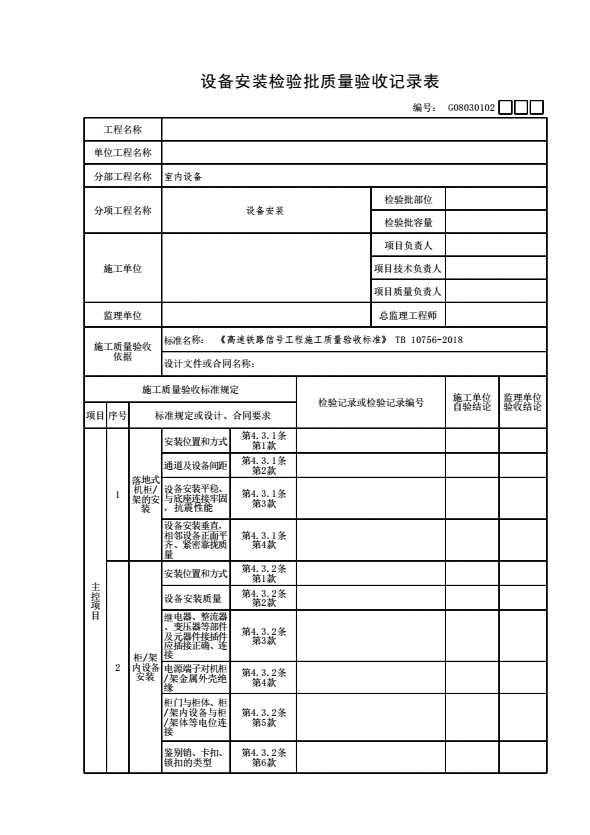 表格名称:G08030102 设备安装检验批质量验收记录表