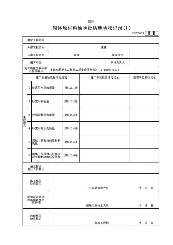 表格名称:03020603 砌体原材料检验批质量验收记录(Ⅰ)